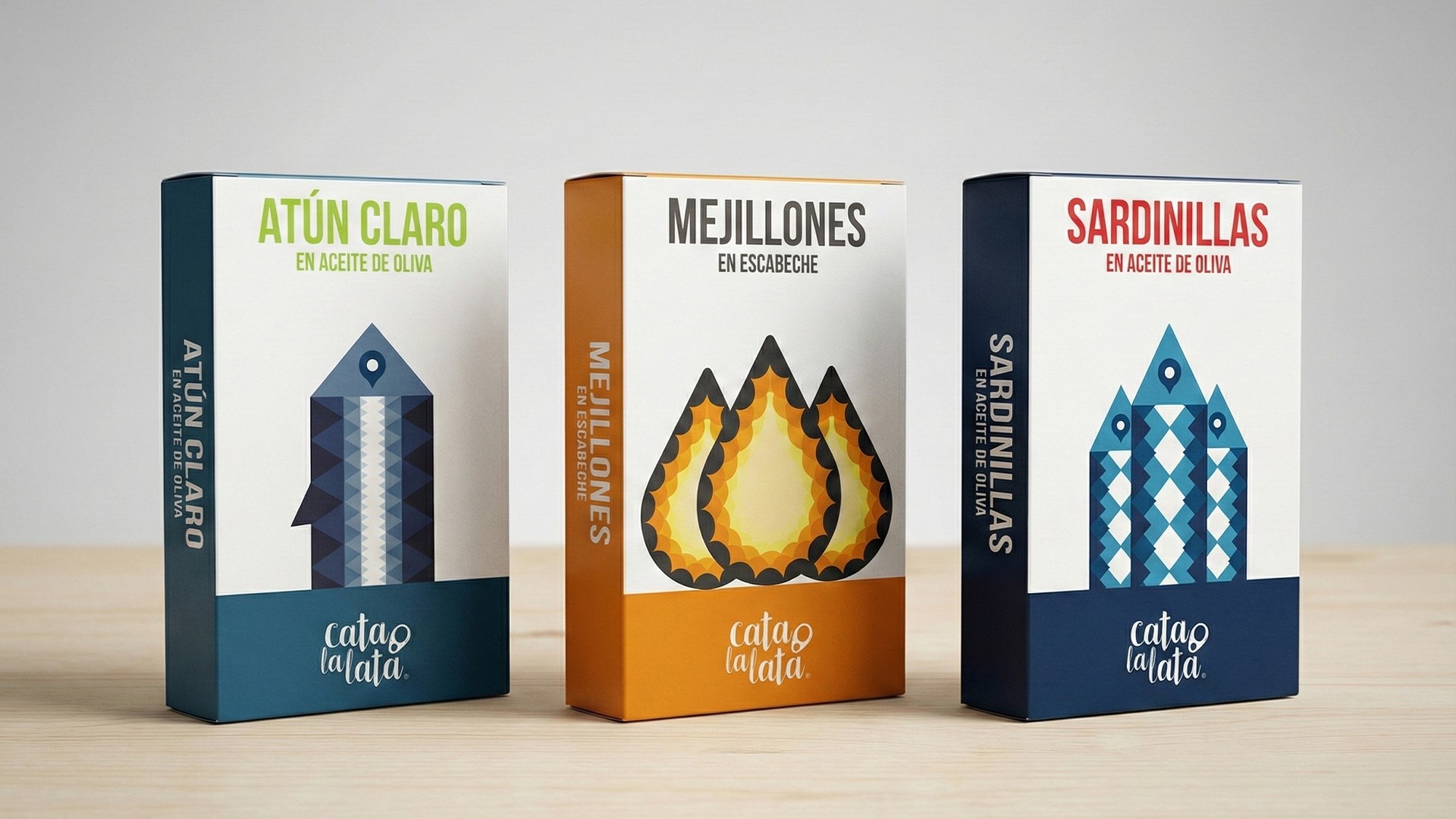 Propuesta de packaging para Cata la Lata pensada para un público amante del diseño y el coleccionismo. Cada variedad se identifica mediante un símbolo geométrico y un color propio, creando una colección llamativa y coherente. El diseño transforma el envase en un objeto gráfico y decorativo, concebido para destacar y permanecer visible más allá de su uso.
